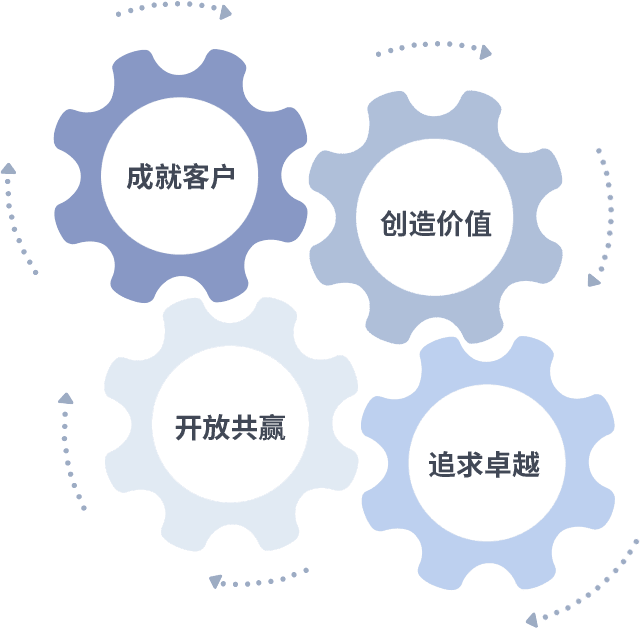 成就客户是一切决策的出发点,,创造价值是衡量所有工作的标准,,,追求卓越是我们做事做人的态度,,,,开放共赢是我们的格局也是最终的结果。。。。价值观的齿轮环环相扣,,,,推动着组织里的每个人不断向前。。。